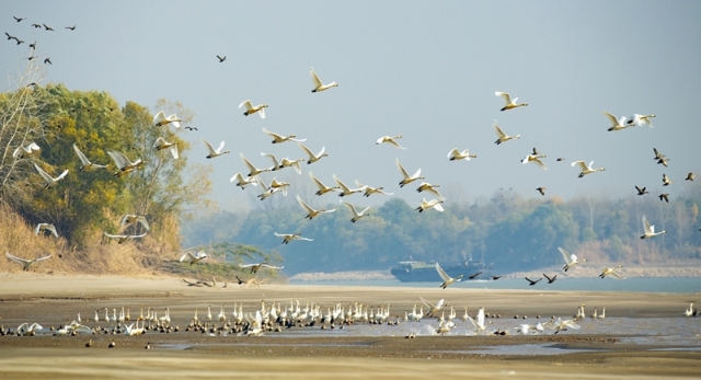 新济洲段长江沿岸,小天鹅伴随货物船只飞翔。南京市委网信办供图