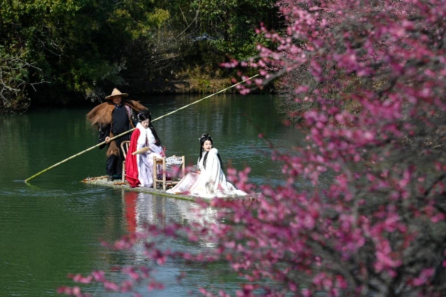 2025年2月18日,汉服爱好者在西溪湿地乘坐竹筏赏梅。新华社记者 黄宗治 摄